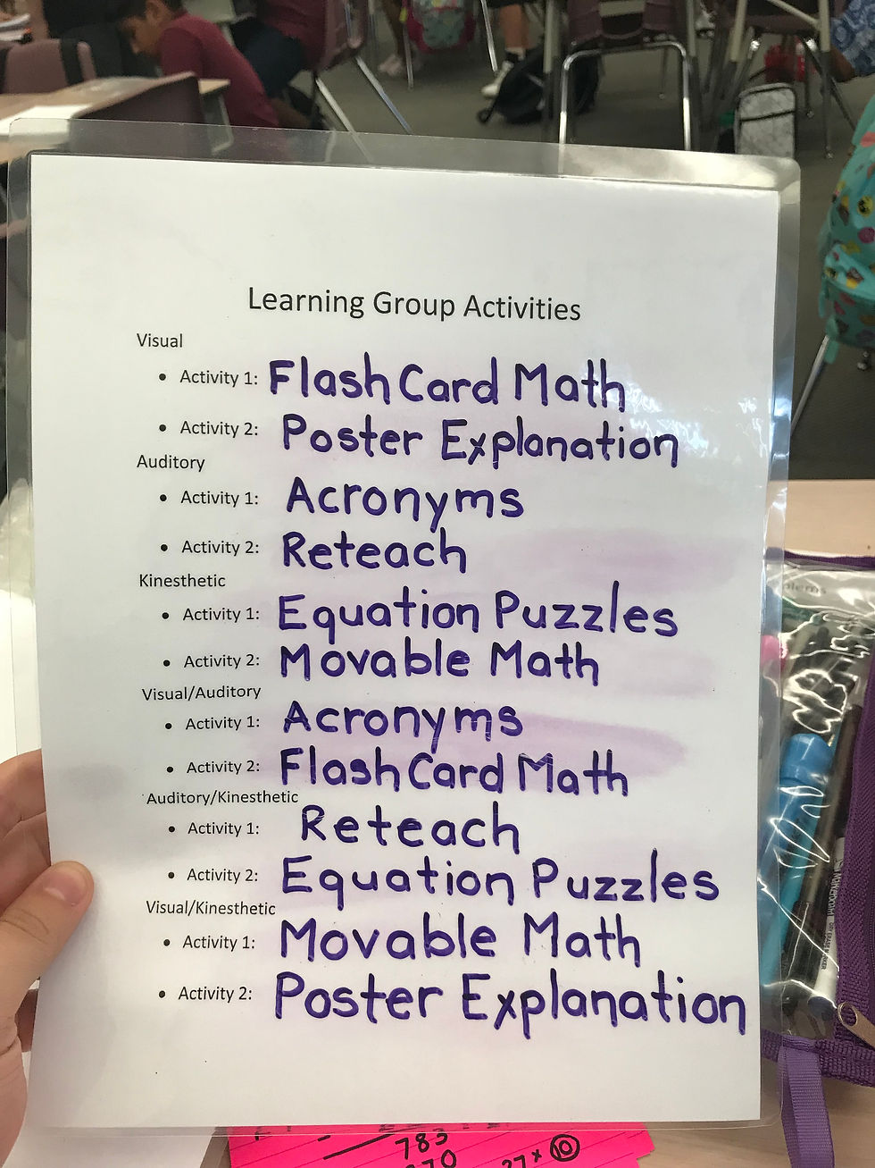 Something I would do the same would be the learning style groups. I believe that if the students were to continue to do work in these groups, we will see more and more growth over time. I would do this because these students can learn a lot through each other, progressing more rapidly since we are already behind on the county calendar. If they do not start doing better soon, the students might get too behind to successfully catch up.